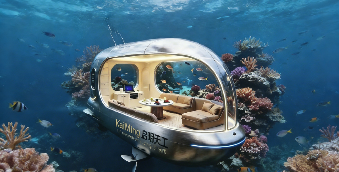 - “KeiMing启明天工®”是一款集深海探索、生态观测与高端居住体验于一体的模块化水下自航式旅居舱。其流线型钛合金外壳与全景穹顶设计,既保障结构强度,又最大化海底景观视野。舱内配备智能温控、循环水处理系统及低光生态照明,支持单人至家庭规模的短期驻留(最长5-30天)。通过可拆卸式推进器与锚定系统,可灵活部署于珊瑚礁区等生态海域,实现“零扰动”海洋科研与沉浸式度假的双重目标。